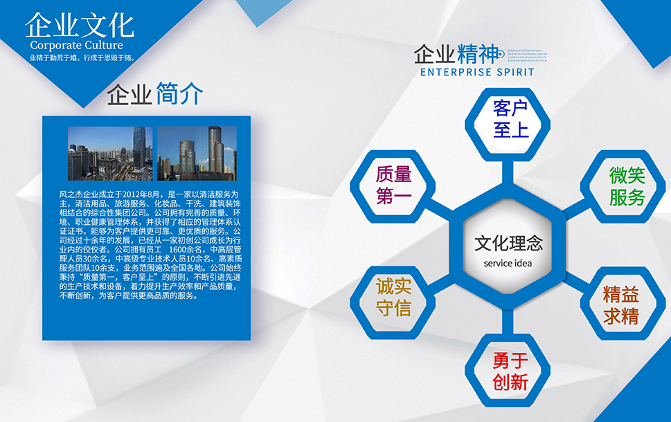 公司是一家以清潔服務為主,旅游,干洗、化妝品、裝修和餐飲相結合的多元化發展運營的服務性企業。企業本著誠信第一、服務至上的原則,依靠公司盡我所能、力我所及的信條從2012年到現在服務了多家企業,現在我們已經擁有了400家左右的清潔服務項目和多家洗衣店。我們會一直牢記服務,創新才是我們企業發展的服務宗旨。